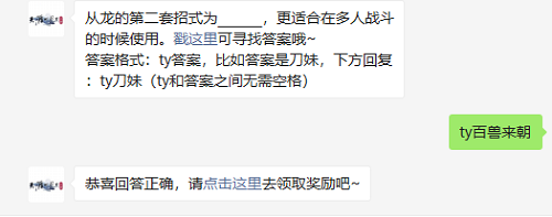 暗区小号卡网1、正确答案:ty百兽来朝。2、从龙有两套招式,第一套招式叫风雷云从,比较适合单人战斗的时候使用。3、第二套招式叫百兽来朝,少侠们听这名字就知道了,它更适合在多人战斗的时候使用!